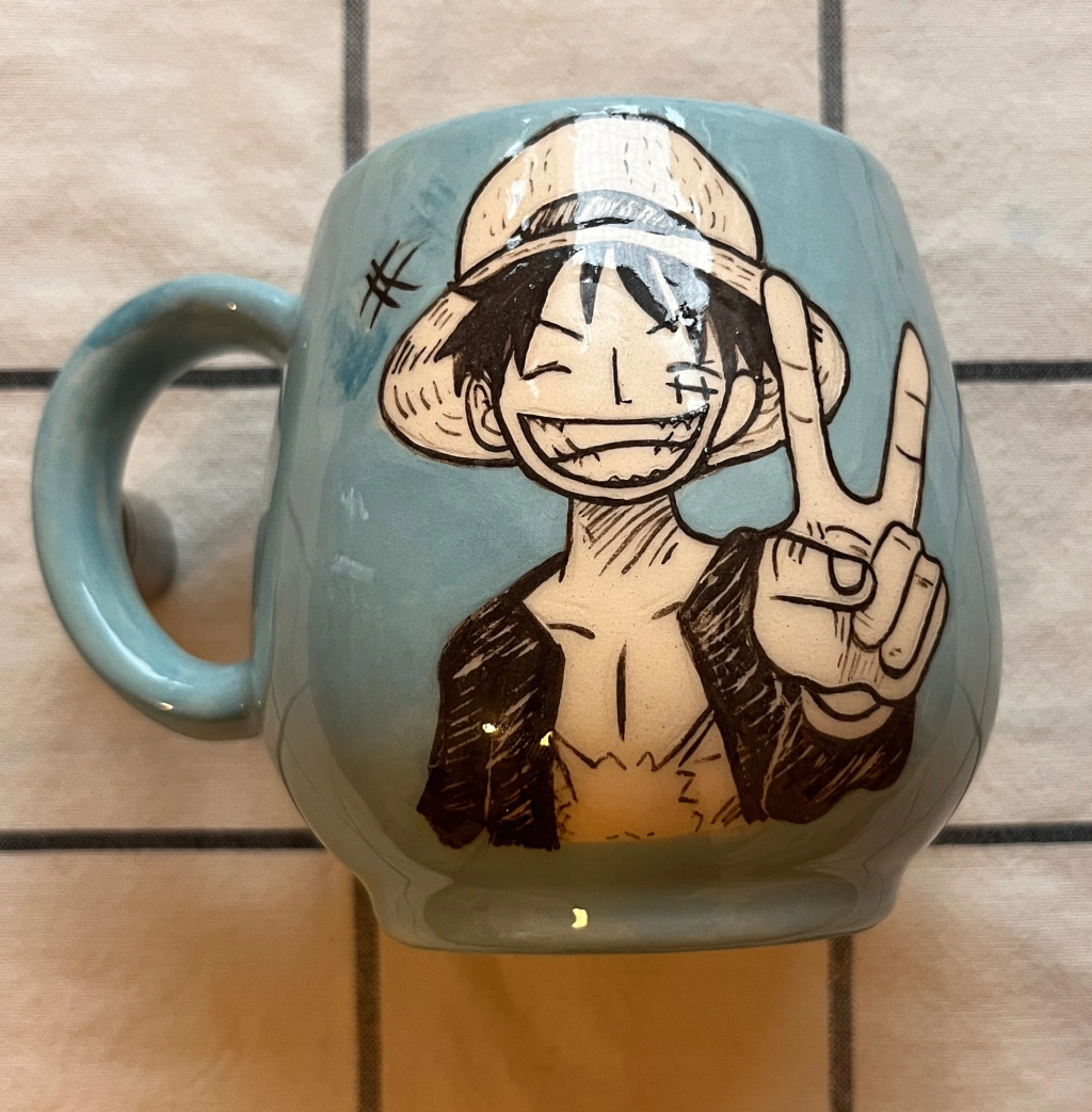 Taza cerámica con diseño de Luffy de One Piece. 100% Hecho a mano.